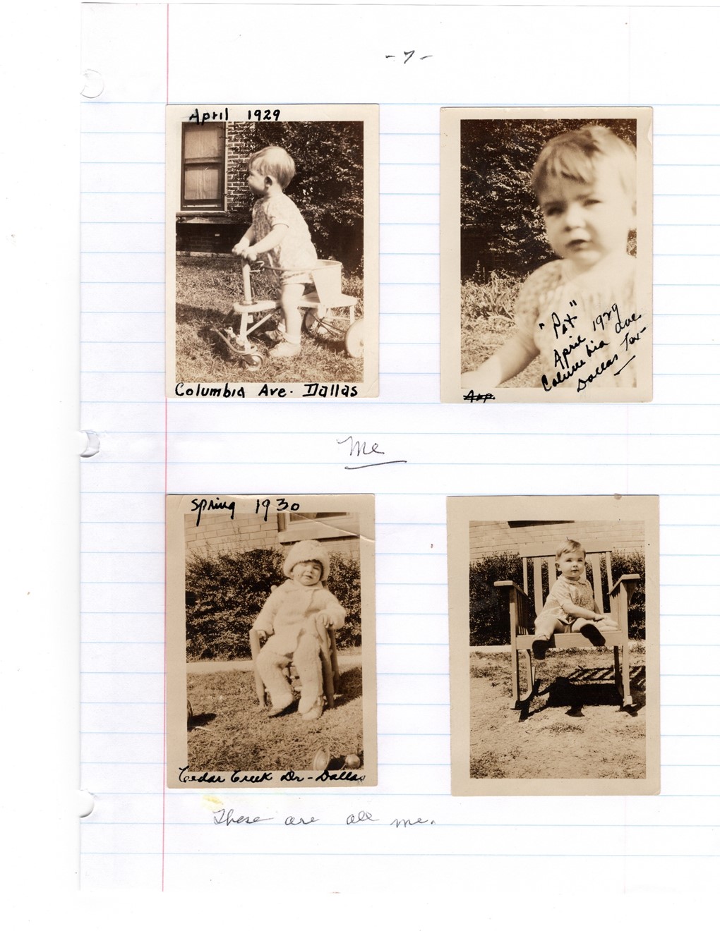When I was two years old, we lived in Dallas, Texas. I remember being in a white-painted baby bed and peeling off the paint and eating it. Also, taking off my diaper and rubbing the contents on the wallpaper. One morning Beanie, my maternal grandmother, came into my room with her long white hair hanging down. She kept it in a bun tied on the back of her head. Seeing her like that scared me, so I screamed and cried. I was really frightened.