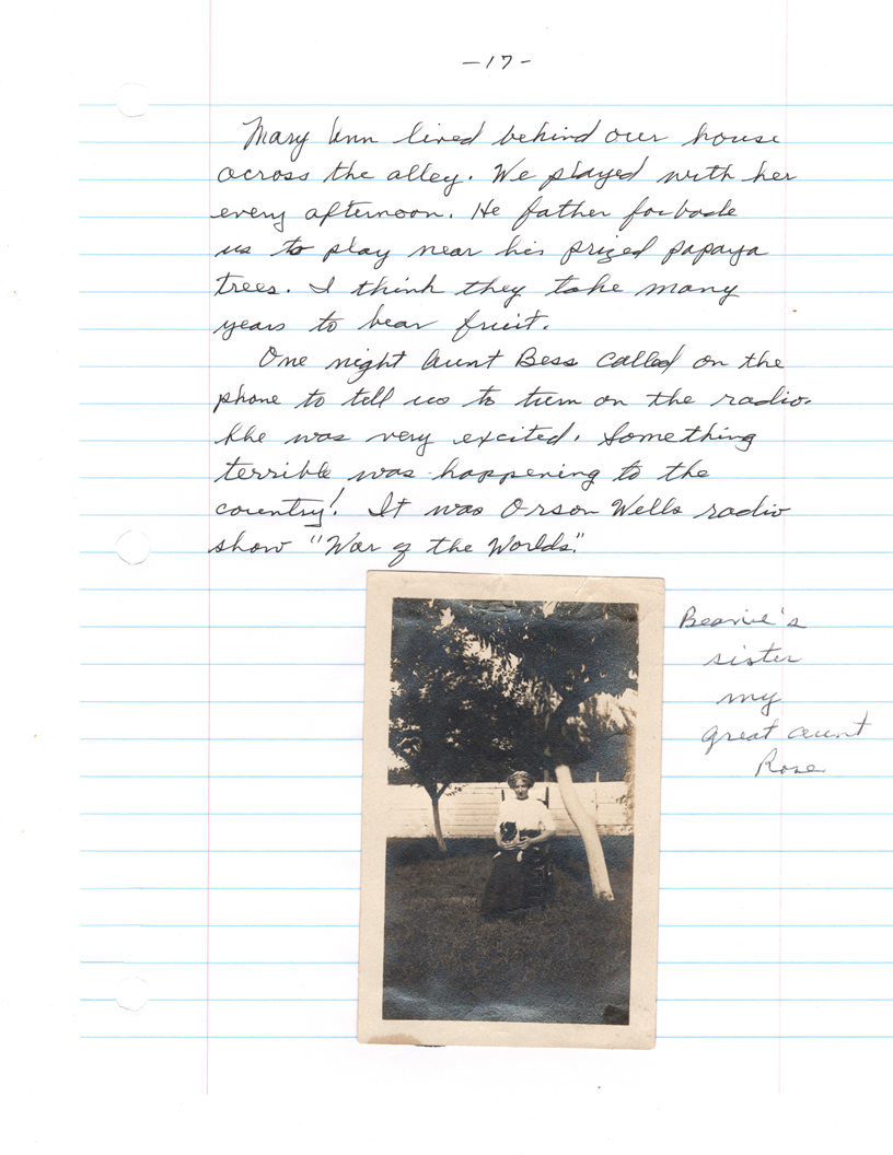 One night aunt Bess called on the phone to tell us to turn on the radio. She was very excited. Something terrible was happening to the country! It was Orson Welle’s radio show “War of the Worlds.”