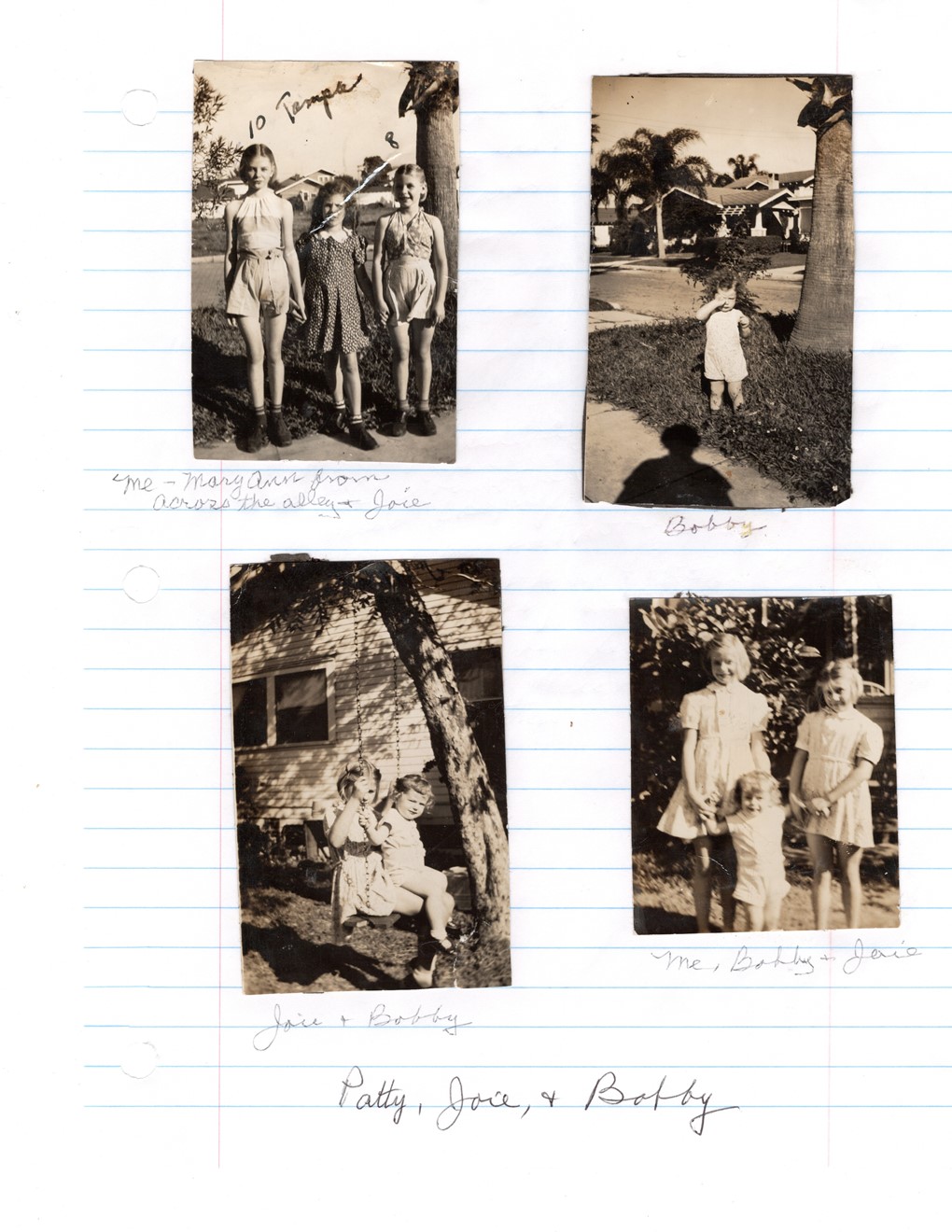 In the second bedroom of that apartment, there was a Murphy bed where Joie and I slept. I remember hearing weird noises at night. I found out years later they were frogs. A girl named Jackie lived next door. We all three got Shirley Temple dolls for Christmas. Jackie and her parents had been visiting her grandparents and, after the holidays, went back to New York. Joie and I cried the day they left. A teenage girl who lived nearby taught us how to do the latest dances-the Big Apple and Trucking. We also love to play hopscotch and jacks.