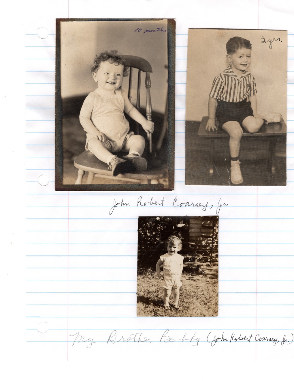 Mother and my father were divorced in 1936. She and Bob Coarsey got married that year. Two years before that, while I was still in the first grade, Joie and I both came down with measles, chickenpox, and whooping cough. Then we had our tonsils out, and I got sick with a kidney infection and spent three weeks in the hospital on Davis island, which was out in the bay across from Tampa.