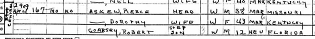 My maternal grandmother, Dorothy, was living with her third husband, Pierce Askew, and her son Robert Coarsey, my Uncle Bob, who was 12 years old at the time. They resided at 2909 Central Ave. Apt. 4, Birmingham, Jefferson, Alabama. I know this address because in my mother’s memoirs there are several telegrams sent by my mother to that address in the early 1950s.