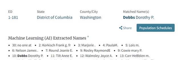 I have found my mother in the U.S. Census for 1950. This time I used the “official” website for the 1950 census (https://1950census.archives.gov/), where they have used “machine learning (AI)” to extract names from the enumeration sheets to build a searchable index. Here, I searched for “Patricia Dobbs” in Washington DC, and I got a few hits for Dobbs or Hobbs, one of which was a direct hit.
