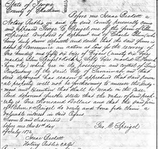 “Before me, Isaac Beckett a Notary Public in and for said County (Chatham) personally came and appeared George C Spiegel one of the firm of Blum & Spiegel composed of the deponent and Charles Blum who being duly sworn deposes and saith that the said firm is about to commence an action at law for the recovery of 156 boxes of cigars (96 boxes marked Blum, Spiegel & Kolb, and 60 boxes marked L. Heischom & Co.) Which are in the possession and control of Louis Furstenberg of the said city of Savannah, and that said deponent has reason to apprehend that said personal property will not be forthcoming to answer the judgment and execution that shall be made in the case. And deponent further states that the value of the said property is $1000 and that the said firm of Blum & Spiegel does verify and bona fide claim a valuable interest in said cigars. Signed George C Spiegel. Sworn to and subscribed before me this 31st day of July 1872 signed Isaac Beckett Notary Public”