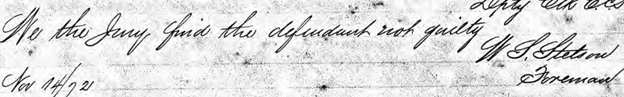 The last line states that “We the jury find the defendant not guilty.” This is signed by the foreman of the jury and is dated November 14, 1872.