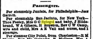 Finally, in the October 14, 1872, edition of the Savannah Morning News, on page 5 is a passenger list for the steamship San Jacinto bound for New York City. There are about a dozen first-class passengers listed. Two of those passengers are “Mrs. G C Spiegel and baby.”
