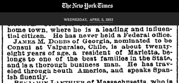 The first item from Wednesday, April 5, 1893, reads: “James M Dobbs of Georgia, nominated to be Consul at Valparaiso Chile, is about 28 years of age, a resident of Marietta, belongs to one of the best families in the state, and is a thorough businessman. He has traveled through South America and speaks Spanish fluently.”