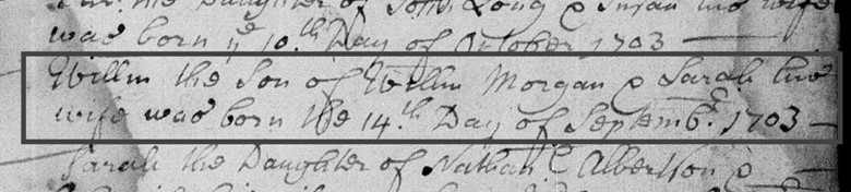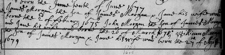 Similarly, William’s birth record followed the record of two of his brothers. His record reads: “William Morgan the son of James Morgan and Jane his wife was born 27 May 1679.