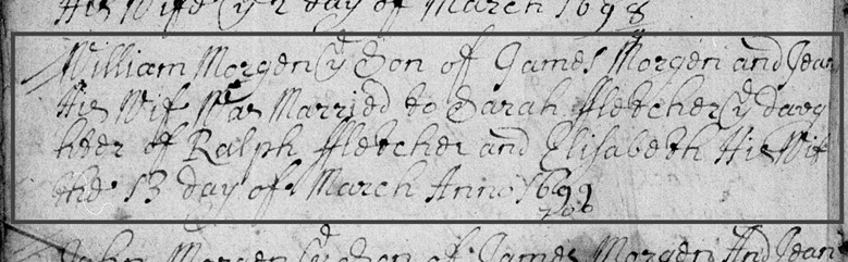 The marriage record for William Morgan and Sarah Fletcher were clustered on the page with other Morgan family entries. The entry for their marriage reads: “William Morgan, son of James Morgan and Jane (Jean) his wife, was married to Sarah Fletcher, daughter of Ralph Fletcher and Elizabeth his wife, the thirteenth day of March Anno 1699.”