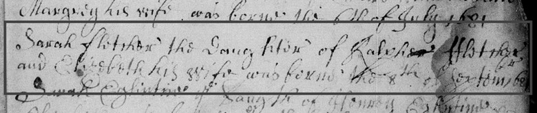 I found Sarah’s birth record on a page lumped with other Fletcher family entries. Her birth record reads: “Sarah Fletcher, the daughter of Ralph Fletcher and Elizabeth his wife was born 8 September 1681.”