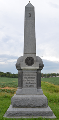 Continuing with the narrative described in the New York report on Gettysburg: It was 9 AM on July 1 when Koenig and his men, returning to Emmitsburg, arrived at the abandoned camping ground of the Regiment. Here he was joined by a squad of men belonging to the 58th who had been on picket during the night; with this picket detail and the 100 men already mentioned, Capt. Koenig had more than half of the Regiment with him. He promptly overtook the Corps, pushing on with all possible speed but was unable to do so, so he was ordered to march with the wagon train. A passing rain shower drenched the men and damaged the roads, but although the water came down in torrents, the storm did not extend to Gettysburg. Heavy artillery was heard about 4 miles from the town, and the men, leaving the train, pressed forward at a fast pace, arriving at Gettysburg about 3:30 PM. After some delay in finding the Corps, the detachment rejoined the Regiment and brigade on Cemetery Hill.