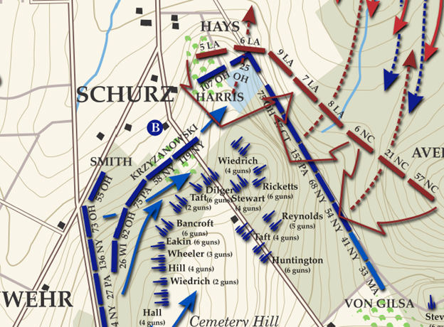 At dusk, Hayes’s Louisiana Brigade and Hoke’s North Carolina brigade assaulted the union position on East Cemetery Hill and, reaching a temporary success, charged up the slope and through the line of cannon in Wiedriech’s battery, driving the gunners from their pieces. Led by Gen. Schurz in person, the 58th and 119th New York hastened to the rescue of the artillery, but the assailants were repulsed without their help. As another attack was momentarily expected, the 58th was ordered to remain one of its companies under Lieut. Schwartz, were sent out as skirmishers to find where the enemy had retired.
