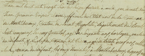 Translation: “In the year 1826 on the afternoon of the 6th of February before Jean Germain Voisard, mayor, officer of the state for the commune of Montécheroux, Canton of Sainte Hippolite, department of Doubs there appeared Jacques Gueutal, age 60 years, a watchmaker, uncle of the deceased, and Nicholas du Commun-dit-Veron, age 39, farmer, cousin of the deceased. Both men live in Montécheroux.”