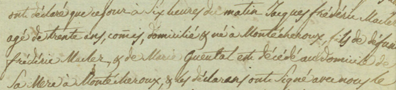In the case of the February 6, 1826, record we are told that a 6:00 o’clock in the morning Jacques Frederick Maler age 30 years, occupation ???, who lived in Montécheroux, who was the son of the late Frederick Maler and Marie Gueutal, died at his mother’s home in Montécheroux.