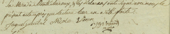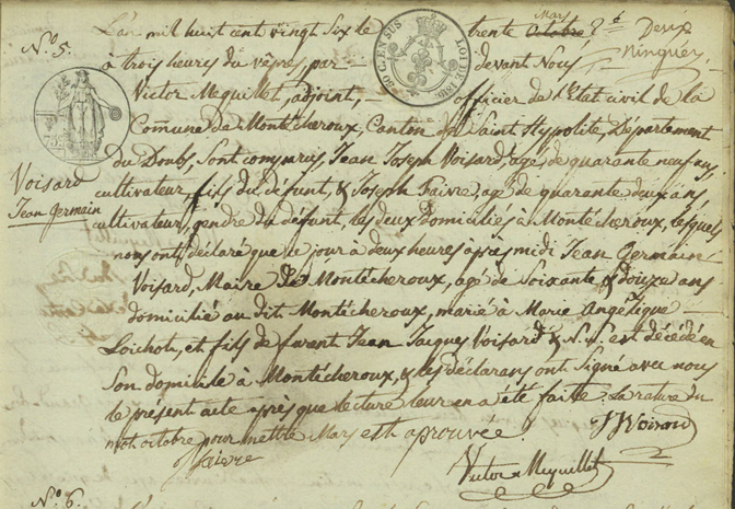 “In the year 1826, on the 30th of May at 3:00 o’clock in the afternoon there appeared before me, Victor Miquelet, adjunct officer of the commune of Montécheroux, in the Canton of Sainte-Hypolite, in the department of Doubs, the following: Jean Joseph Voisard, age 49, farmer, son of the deceased, and Joseph Faivre, age 42, farmer, son-in-law of the deceased, who both live in Montécheroux, declared that today at 2:00 o’clock in the afternoon, Jean Germain Voisard, mayor of Montécheroux, age 72 years a resident of Montécheroux, husband of Marie Angelique Loichat, and son of the late Jean Jacques Voisard & N.N., died at his home in Montécheroux. We signed this record after I read it to them.”