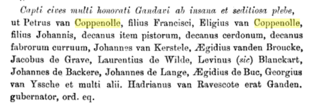 Jan van Coppen(h)olle is mentioned in 1479 as the father of Willem van Coppenolle. He was leader of the Ghent revolt against Maximilian of Austria, (son of Frederick the Third) was appointed in 1477 in rebellious Ghent as a receiver, charged with the recovery of the city funds that the previous rulers had appropriated. He also acted as one of the leaders of the Ghent militias in their fight against the invading French.