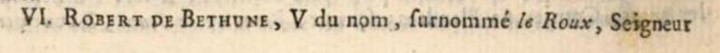Robert V De Bethune, nicknamed le Roux, was Seigneur de Bethune de Richebourg de Warneston & de Choques & Advocate of Arras and was one of the most renowned Lords of the House of Bethune. He was nicknamed le Roux (the red) because of his hair color. He went with the Count of Flanders, Guy de Boullion, to Palestine as part of the expedition of Philippe Auguste during the Third Crusade. He died at the famous siege of Ptolémaïde (aka Ptolemais Akko, aka Acre) in 1191. From his marriage to Adelaïde de Saint Pol, granddaughter of Hugues Comte de Saint-Pol, he had issue: