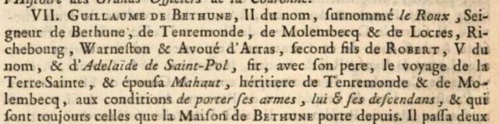 Guillaume II de Bethune, nicknamed le Roux (the red) was seigneur de Bethune, de Tenremonde, de Molembecq & de Locres, Richebourg, Warneston & Advocate of Arras. He was the second son of Robert V and Adelaide de Saint Pol. He accompanied his father on a trip to the Holy Land during the Third Crusade. He married Mahaut, heir of Tenremonde & of Molembecq. He made a second trip to the Holy Land & on his return, he died in 1213. Mahaut de Tenremonde died on April 18, 1224. They had the following issue: