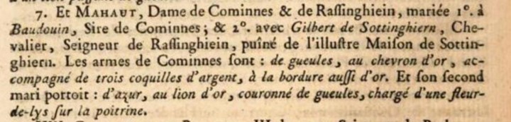 - Mahaut, Lady of Cominnes & de Raffinghiein, married first to Baudouin, sire de Cominnes & secondly with Gilbert de Sottinghiern, a knight & Lord of Raffinghiein.