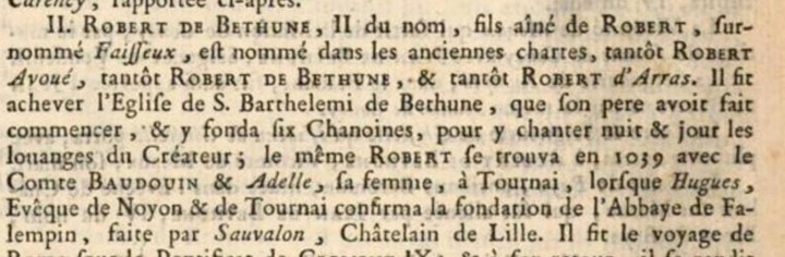 Robert II de Béthune, the eldest son bearing the name Robert, was also known as Faisseux (?) and appeared in historical records under various titles, such as Robert Avoué, Robert de Béthune, and Robert d’Arras. He undertook finishing the Church of Saint Barthélemy in Bethune, a project initiated by his father. He established a community of Canons who would sing praises to the Creator, day and night. Around 1039, Robert found himself in the company of Count Baudouin and his wife Adelle in Tournai. During this time, Hugues, the Bishop of Noyon and Tournai, validated the foundation of the Abbey of Falempin, which Sauvalon, Châtelain de Lille, had established.