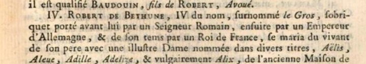 Robert IV de Bethune, nicknamed “the Fat,” married during his father’s lifetime to an illustrious Lady named in various titles Aëlis, Aleue, Adille, Adelize, and vulgarly Alix de Peronne, of which she remained the principal heir of that House.