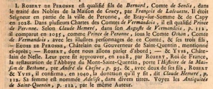 Robert I de Peronne was recorded as the son of Bernard, Comte de Senlis in The Treaty of the Nobles of the Maison de Coucy by François de Lalouette. However, other documents show him to be the son of Albert I, Count of Vermandois (see below). He was Lord in part of the city of Peronne de Bray of Somme & Capy in 1028. In several Charters of the Counts of Vermandois, he is called Prince of Peronne. According to Claude Hemeré in his Auguste de Vermandois, he appeared in 1035 as Prince of Peronne for Count Othon, Count of Vermandois, with the illustrious figures of this County & his three sons Eudes De Peronne, Châtelain or Governor of Saint Quentin. Robert, who follows & Yves Châtelain de Nesle. Their father had Robert, King of France, approve in 1028 the restoration of the Abbey of Mont Saint Quentin carries the History of the Maison de Bethune by André du Chesne p 95 & with two of his sons, Robert & Yves. He confirmed in 1040 the donation he made there, said Claude Hemeré. His wife is named Adelise (de Saint Quentin) in various titles.