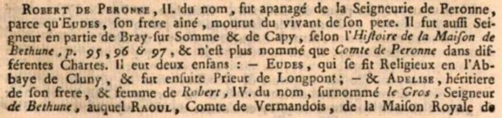 Robert II de Peronne of the name was appendaged to the Seigniory of Peronne because Eudes, his eldest brother, died during his father’s lifetime. He had two children Eudes who became a Religious in the Abbey of Cluny & Adelise, heir to his brother & wife of Robert IV, named “the Fat,” Lord of Bethune.