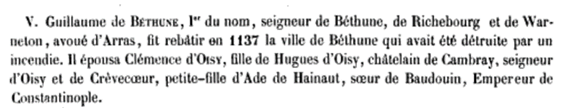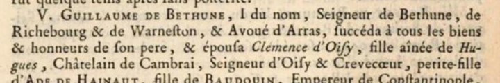 Guillaume I de Bethune by the name Lord of Bethune de Richebourg & de Warneston & Advocate of Arras succeed all the goods & honors of his father and married Clemence d’Oisy eldest daughter of Hugues, Châtelain de Cambrai, Seigneur d’Oisy & Crevecœur.