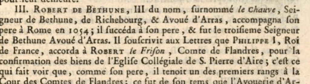 Robert III de Bethune, nicknamed the Bald, was Lord of Bethune de Richebourg & Advocate of Arras, accompanied his father to Rome in 1054; he succeeded his father & became the third Lord of Bethune Advocate of Arras. He subscribed to the Letters that Philippe I, King of France, granted to Robert the Frison, Count of Flanders, for the confirmation of the property of the Collegiate Church of St Pierre d’Aire, which shows that, like his father, he held one of the first ranks at the Court of the Counts of Flanders it was in its time that the Avouerie (advocate or lawyer) of Arras shared between the two owners was reunited at its head by the death of the Advocate Jean, who died without issue & it is since this time that this Avouerie was no longer divided & was owned by the Lords of Bethune alone. During the trip of the Count of Flanders, Godfrey of Bouillon & other Christian Princes for the Holy Land during the First Crusade, Robert the Bald stayed with the Countess of Flanders to assist her with her advice. We mark his death on October 6, around 1101, as the Martyrology of the Church of St Bartholomew de Bethune bears him. He left three sons who were:
