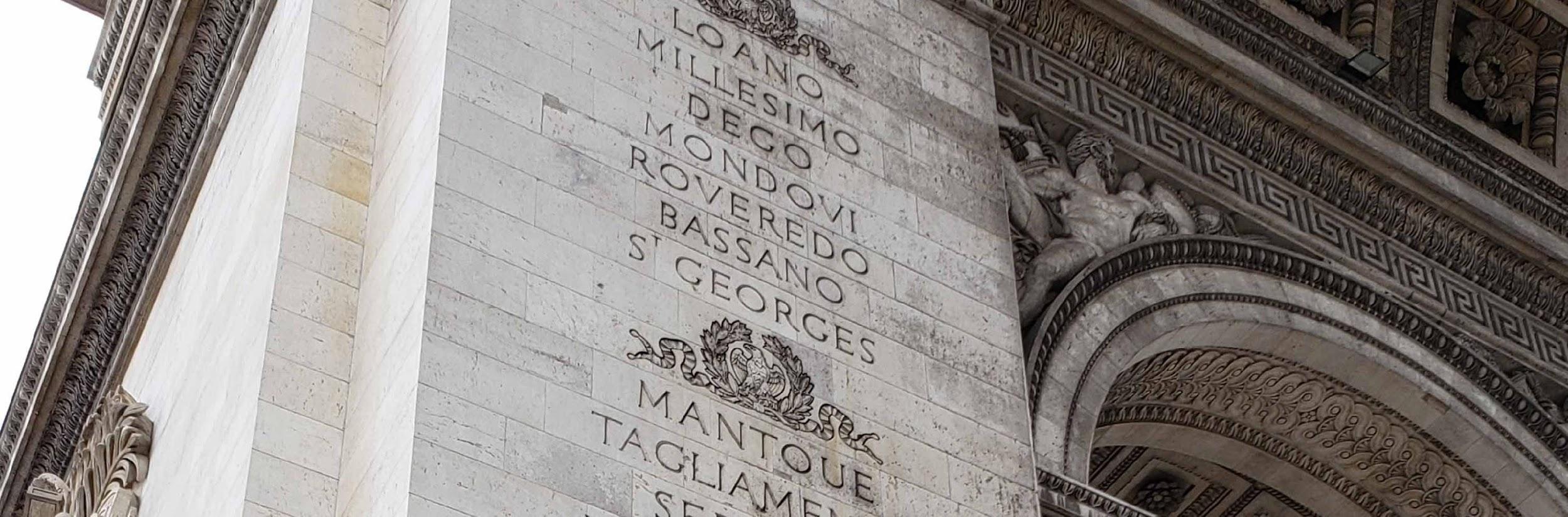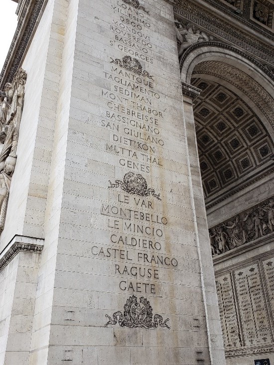 I took several photos of the beautiful columns that support the archway, but the column that held the most significance for me was the one inscribed with the name of a battle where one of my ancestors, according to my research, had fought. This battle, “Le Var,” marked a crucial moment in my ancestor’s military service. It bugged me that of 158 names of battles – every one a victory of the French Army – only two, Le Var and one other, are missing a Wikipedia article.