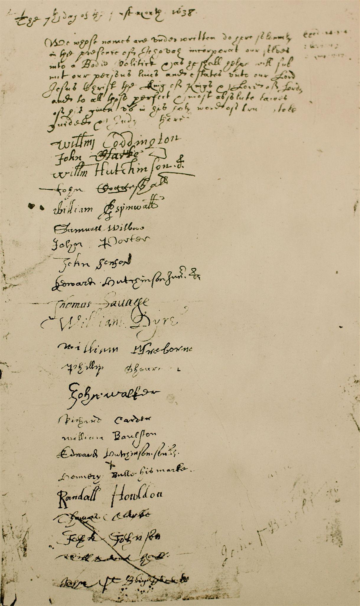 The Portsmouth Compact, signed on March 7, 1638, is a historically significant document because it represents one of the earliest examples of a political agreement based on democratic principles in the United States. The document was written and signed by a group of Christian dissidents seeking religious freedom from the governmental oversight of the Massachusetts Bay Colony by moving to Aquidneck Island to set up a new colony. Among this group was Anne Hutchinson, who had been banished from Massachusetts Bay following the Antinomian Controversy there.