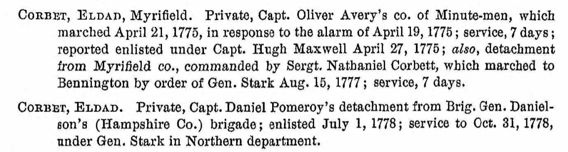 Eldad Corbet (5X gGF) was 23 years old in 1775. According to the National Archives muster rolls, he served in Major John Brown’s Detachment of Militia for New Hampshire, Vermont, and Massachusetts in the summer of 1777. He was at the Battle of Bennington. The battle occurred in New York over the border from Bennington, Vermont.