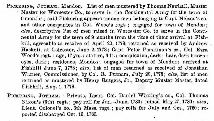 Jotham Pickering (4X gGF) was 14 years old in 1775. Served in the 6th Massachusetts Regiment in Lieut. Col. Daniel Whiting’s Co. of Colonel Thomas Nixon’s Regiment. He served four months and 19 days. In the summer of 1780, his unit marched to the sprawling Continental Army encampment at Fishkill, New York, and at the end of the summer, marched back to Mendon, Massachusetts.