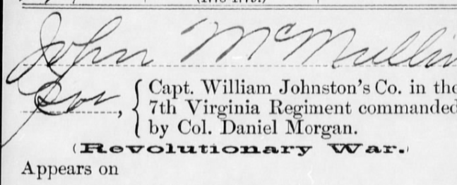 John McMullan (5X gGF) was 35 years old in 1775. He served in the 11th Virginia Regiment (1776/77). In 1778, the 11th & 15th Virginia Regiments (1778) were folded into a reorganized 7th Virginia Regiment under the command of Daniel Morgan. He is said to have served for five years, from 1776 to 1780. According to family lore, he was hospitalized and nearly died while at Valley Forge. Years before the Revolution, he married my 5x great-grandmother, Theodosia Beazely, and by her, he had five children, including my ancestor Patrick McMullan. At some point, after not hearing from John and believing him to be dead, Theodosia left John for another man. While most have only two muster roll cards, John’s pay record in the National Archives consists of 24 records. He was at the Battle of Brandywine. Other places mentioned in the muster rolls are Valley Forge, PA; Camp White Plains, NY; Camp Pompton Plains, NJ; Camp New Ark (Newark), NJ; and Camp Middlebrook, NJ.