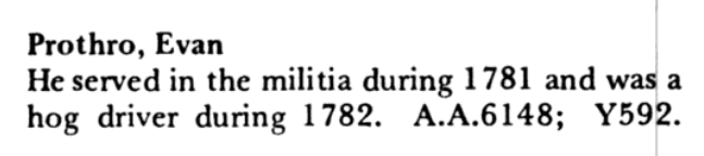 Evan Prothro (5X gGF) was 33 years old in 1775. According to the Roster of South Carolina Patriots, Evan “served in the militia during 1781 and was a hog driver during 1782. A family lore says he served under Francis Marion, the Swamp Fox. In 1781/82, Marion was made a brigadier general and placed in command of a South Carolina militia brigade. Battles fought in South Carolina during Evan’s time in service were the Battle of Cowpens (Jan 1781) and the Battle of Guilford Court House (Mar 1781).