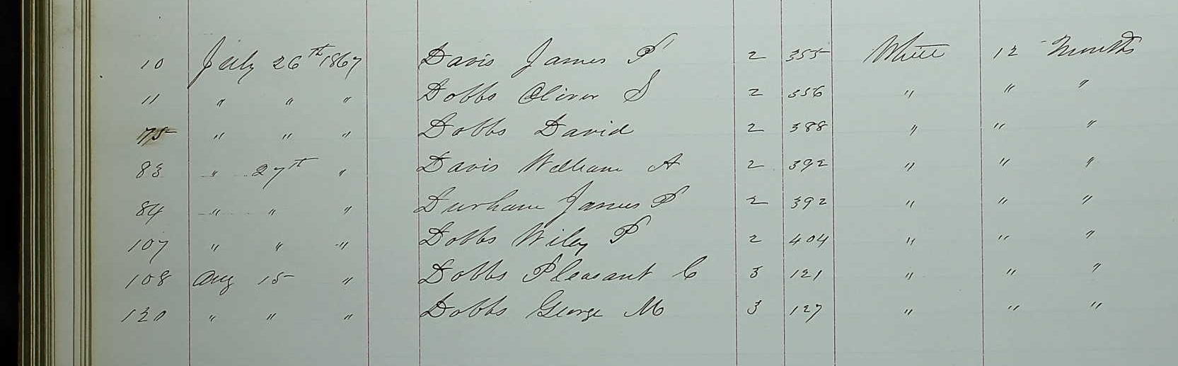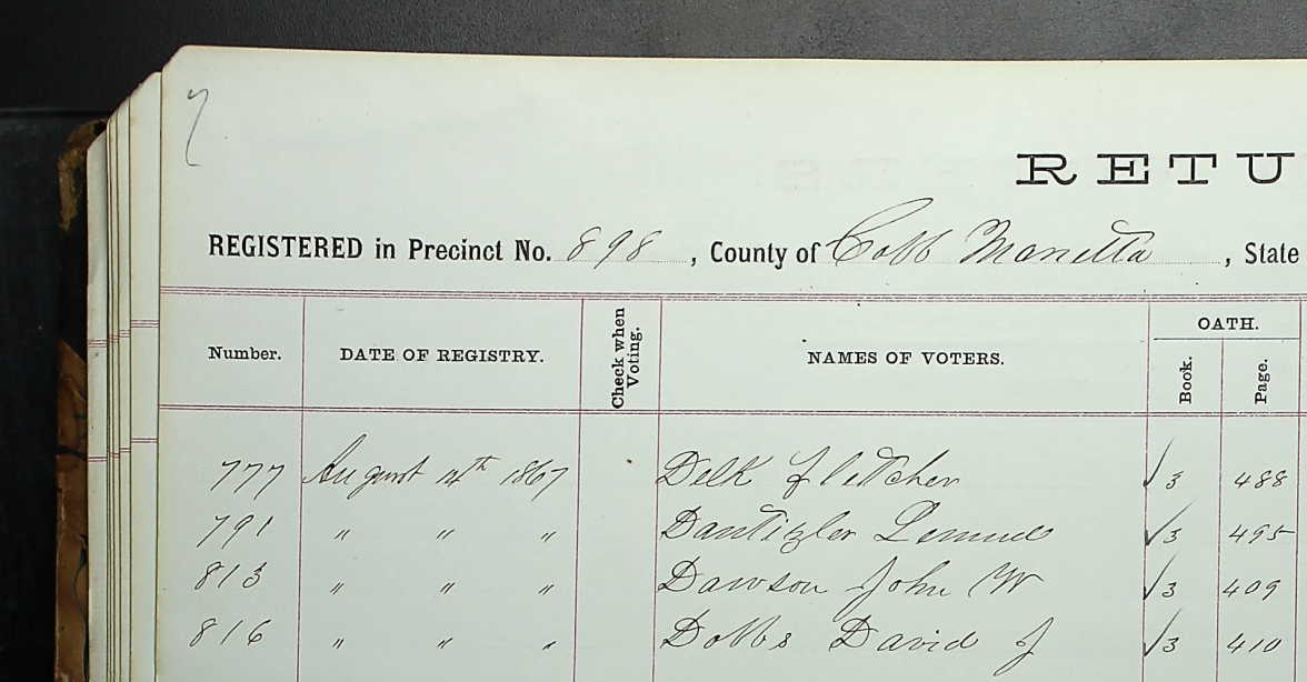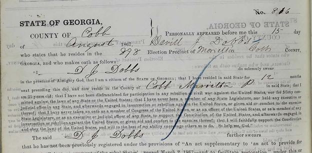 I discovered two crucial pieces of evidence. First, a Cobb County voters’ register from 1867 lists D.J. Dobbs’s father, David Dobbs, along with several uncles and cousins, as registered voters. D.J. Dobbs is conspicuously absent. To me this indicated he couldn’t vote until his civil rights were restored. I was wrong.