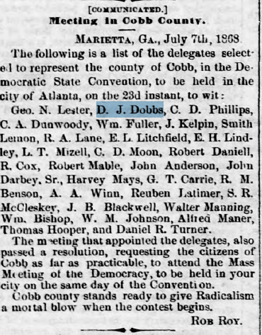 Then I see that there is also a report of a meeting of the Democratic Party in Cobb County that was held in Marietta Georgia on July 7, 1868. Here they chose delegates to attend the state convention of the Democratic Party of Georgia and one of those delegates was my great, great-grandfather D. J. Dobbs. Their statement ends with “Cobb County stands ready to give Radicalism a mortal blow when the contest begins.”