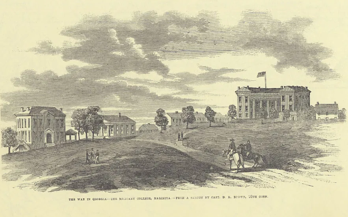 The sight of The Institute won the commendation of the Tribune correspondent.”The view from this point, though are exceeded by that from Kennesaw Mountain, is still a commanding one, the town being in full sight, and making a beautiful appearance. The grounds are well shaded by fine forest trees and the sides of the road from this point to town is also finely shaded.” [Ed. Note: My third great grandfather, Colonel David Dobbs, was one of the founders of GMI]